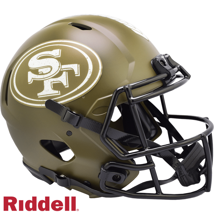 The Salute to Service helmets are inspired by those used by the military for decades, and are meant to honor the memory and selfless sacrifices of service members past and present. Each helmet features a dark satin olive green color shell with black internal parts, decals that are a stressed off-white single color depiction of team logos, a chevron top stripe pattern, a stencil city name on front bumper, stencil “Salute to Service” back bumper, US Flag and official Sature to Service Ribbon. Made by Riddell.