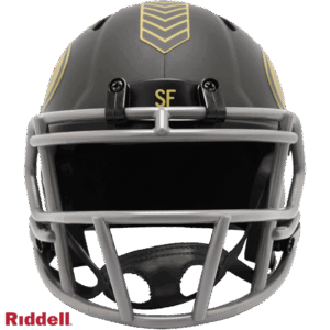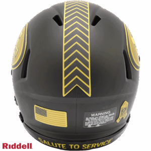 The 2025 NFL Salute to Service helmets are inspired by those used by the military for decades and are meant to honor the memory and selfless sacrifices of service members past and present. Each helmet is painted in a dark green satin finish with black appointments and dark gray face mask. The matte tonal decals match the official 2025 Salute to Service design elements and colorway. A chevron stripe pattern is used on every helmet, along with city name abbreviations on front bumpers, and Salute to Service back bumper decals. The helmet includes the official Salute to Service ribbon and a tonal U.S. flag. Made by Riddell.