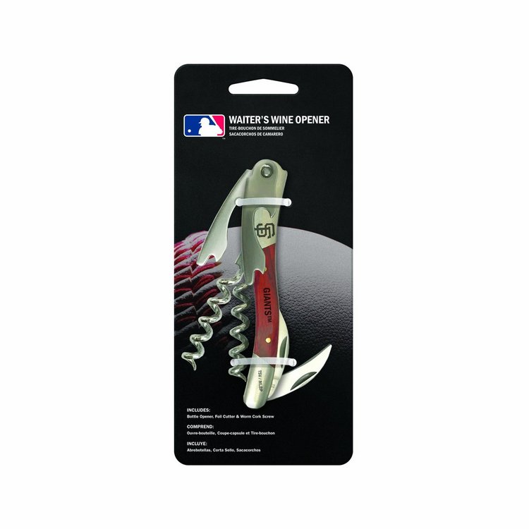 Features corkscrew, bottle opener and foil cutter blade. Corkscrew, bottle opener and knife are all stainless steel. Handle made of rosewood with laser etched team logo and workmark. Approximate size opened is 4.5 inches long by 1.5 inches high. Restaurant style waiter opener. Made by The Sports Vault.