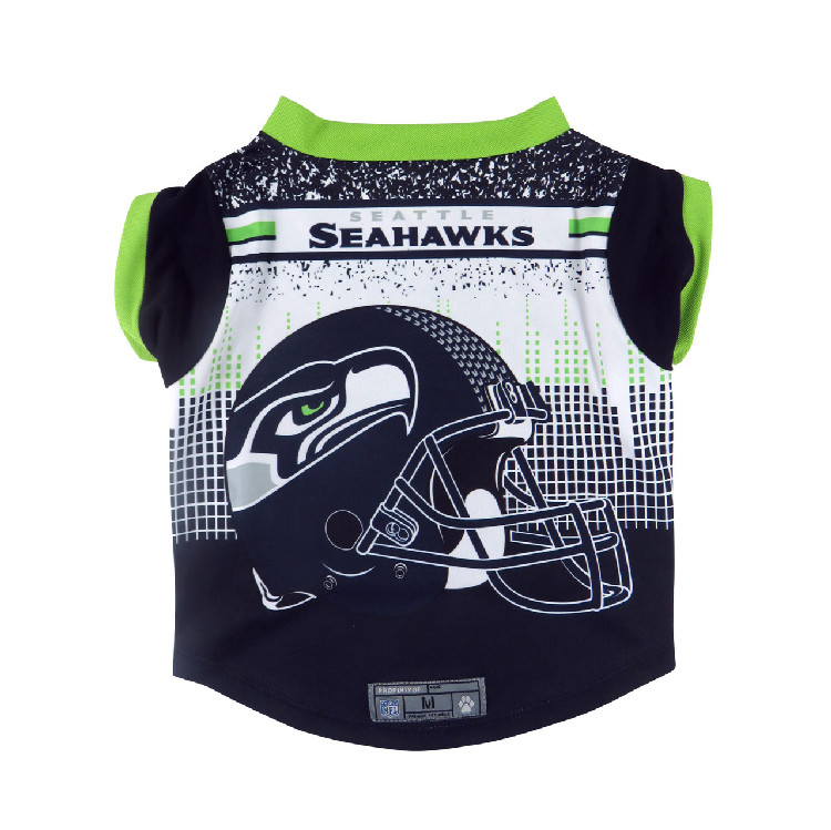 Your pet will go all-pro with the Performance Tee. This moisture-wicking polyester Tee-shirt sports a colorful back with team helmet graphics. The front and sleeves are team color. The stretch fabric makes it easy to pull on or off your pet. Stretch polyester knit. Full color print back, team wordmark on front. Contrast collar and sleeves. Woven jock tag. Made by Little Earth.