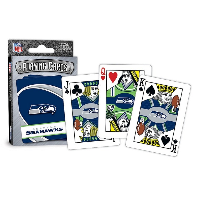 Set includes 52 playing cards and 2 jokers. Card size is 3.5 x 2.5 inch. All face cards and jokers have individuallized team designs. Ace of Spades has special wood cut football design. Made by MasterPieces Puzzles.