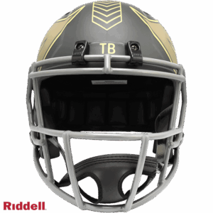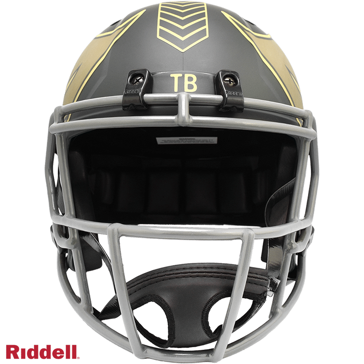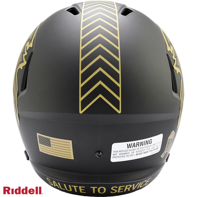 The 2025 NFL Salute to Service helmets are inspired by those used by the military for decades and are meant to honor the memory and selfless sacrifices of service members past and present. Each helmet is painted in a dark green satin finish with black appointments and dark gray face mask. The matte tonal decals match the official 2025 Salute to Service design elements and colorway. A chevron stripe pattern is used on every helmet, along with city name abbreviations on front bumpers, and Salute to Service back bumper decals. The helmet includes the official Salute to Service ribbon and a tonal U.S. flag. Made by Riddell.