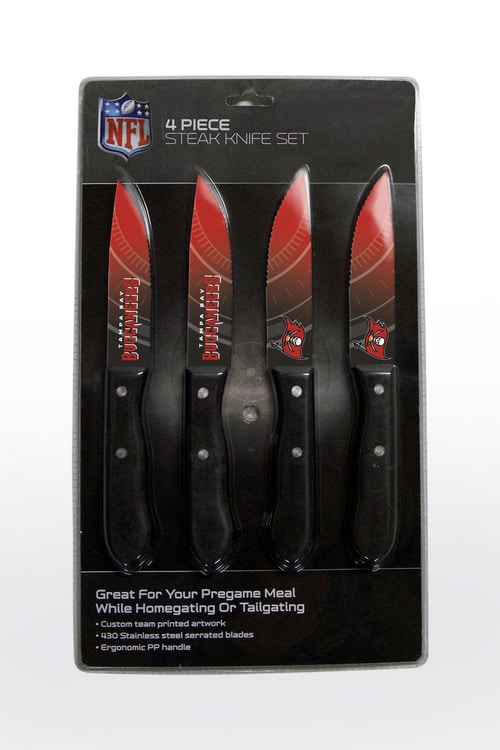 Perfect for your next game night celebration or pregame meal at home or outdoors! 430 stainless steel serrated blade. Custom team printed artwork. Ergonomic