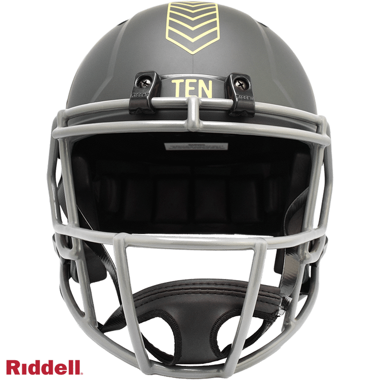 The 2025 NFL Salute to Service helmets are inspired by those used by the military for decades and are meant to honor the memory and selfless sacrifices of service members past and present. Each helmet is painted in a dark green satin finish with black appointments and dark gray face mask. The matte tonal decals match the official 2025 Salute to Service design elements and colorway. A chevron stripe pattern is used on every helmet, along with city name abbreviations on front bumpers, and Salute to Service back bumper decals. The helmet includes the official Salute to Service ribbon and a tonal U.S. flag. Made by Riddell.