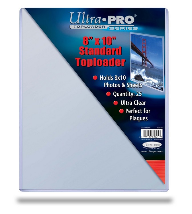 8″ x 10″ (203.2mm x 254mm) toploader. Keeps cards, photos, magazines and other collectibles clean, recyclable. Packs of 25. Made by Ultra Pro