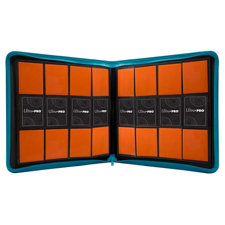 Teal padded leatherette cover with zipper closure. Stores up to 480 cards in Deck Protector sleeves in side-loading pocket. Each row holds a 4-card playset. Made with acid-free, non-PVC materials for premium protection. Made by Ultra Pro.