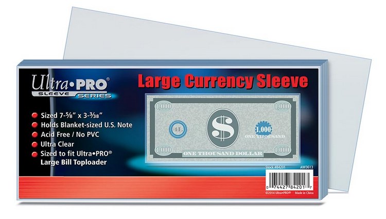 Designed to hold currency sized 7 5/8″ x 3 3/38″. Sized to fit Ultra PRO Large Bill Toploader. Ultra clear. Acid free, no PVC. 100 count per pack. Made by Ultra Pro